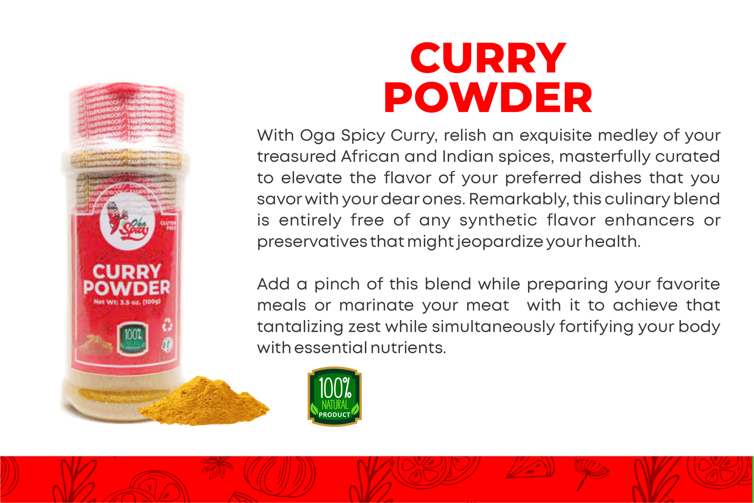 Oga Spicy Curry is a masterful fusion of Africa’s bold traditional spices and the rich, aromatic heritage of Indian cuisine—carefully blended to bring warmth, color, and unforgettable flavor to your kitchen. Every spoonful is crafted with intention, combining time-honored spice traditions with modern culinary excellence to elevate everyday meals into vibrant feasts. Whether you’re cooking for family or sharing a special moment with loved ones, our curry blend adds depth, aroma, and a touch of magic to every dish. From the first scent that fills your home to the final taste that lingers on the palate, Oga Spicy Curry is designed to heighten your culinary experience and make every meal a moment of connection, joy, and satisfaction. Discover the beauty of flavor crafted with care—and let your meals bring people together.
